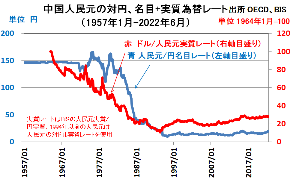 中国は名目為替レートと実質為替レートを引き下げてきました。1980年は1人民元が151円でした。それが直近では20円です。9割近い下落です。賃金などコストも9割近く下がったわけです。