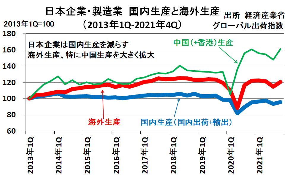 日本企業は国内生産を減らし、海外生産を増やしてきました。海外の中では中国生産を一番多く増やしてきました。